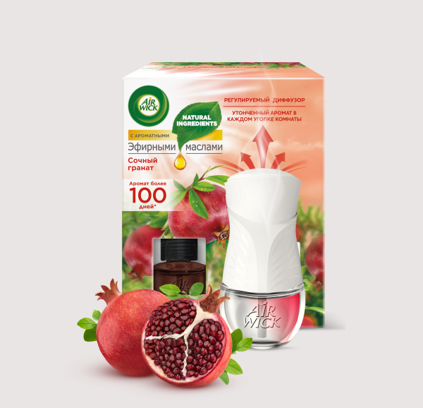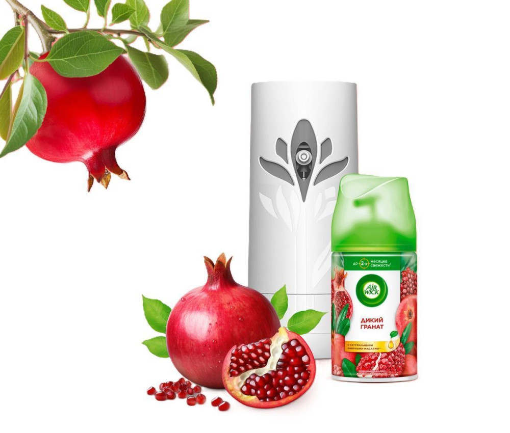 Автоматический освежитель воздуха Air Wick® «Дикий гранат» с натуральными эфирными маслами устраняет неприятные запахи на кухне и поддерживает свежесть до 2 месяцев. Одного баллона достаточно, чтобы обеспечить до двух месяцев свежести. Работу освежителя не нужно контролировать, отвлекаясь от готовки – сухое распыление происходит автоматически через заданные интервалы.